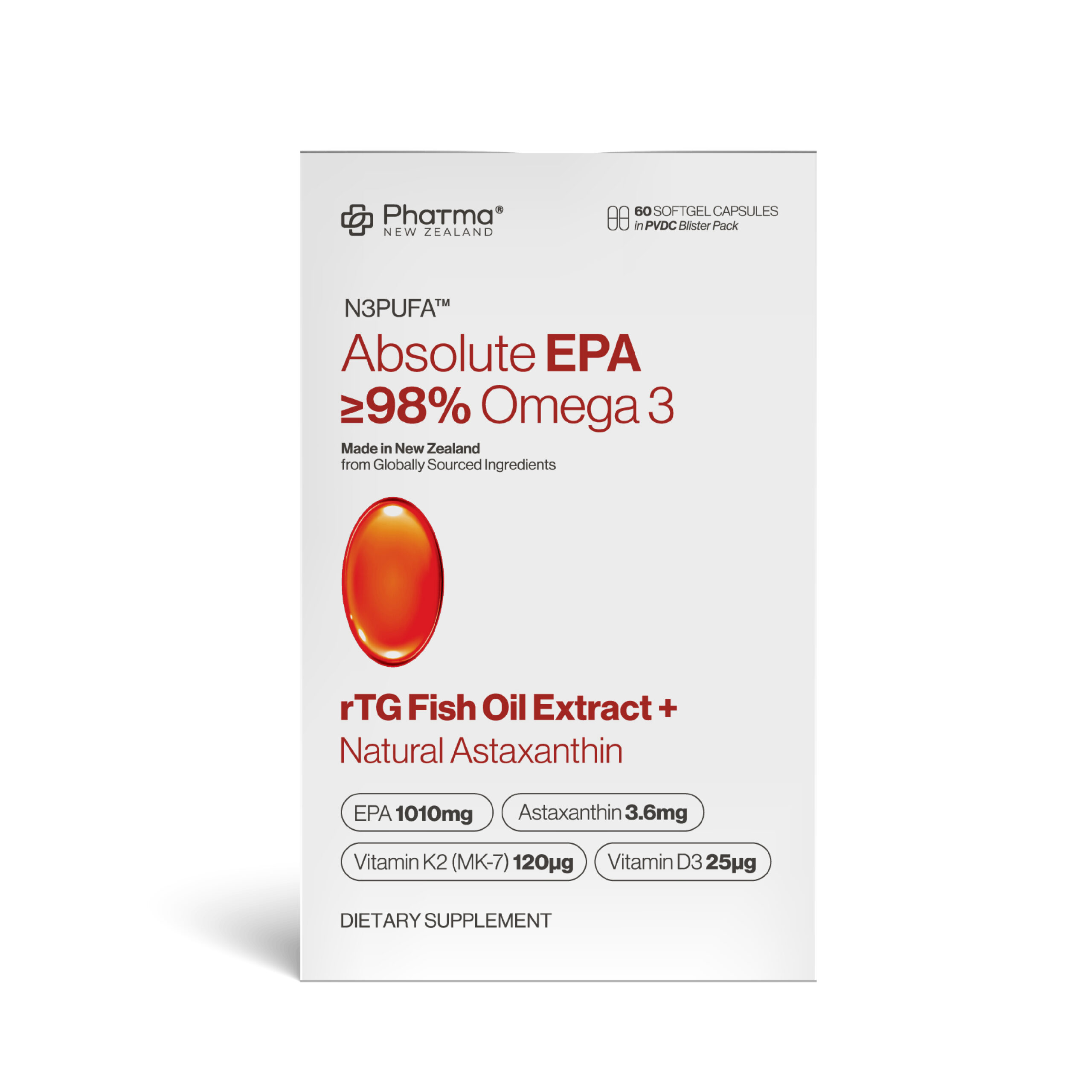 Absolute EPA is our ultra-purified, EPA-dominant Ultra high-purity rTG fish oil, delivering an exceptionally high EPA concentration for everyday vascular support. Produced using advanced multi-stage molecular distillation (10+ distillation steps) to achieve outstanding purity, it helps support healthy triglyceride metabolism and cardiovascular wellbeing, and includes natural astaxanthin to provide additional antioxidant protection for the vascular system. Proudly designed under the PharmaOmega® 5D Framework with PVDC blister pack.